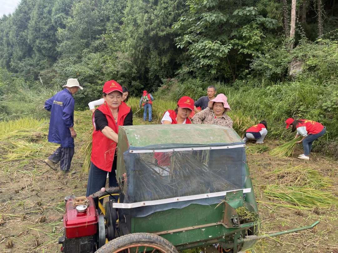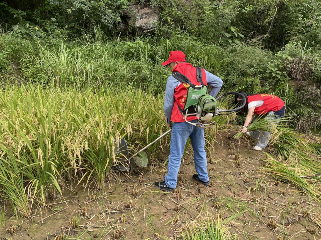 9月26日,10余名志愿者来到秋池种植家庭农场,伴随着收割机的轰鸣声,志愿者们身穿红马甲,在稻田里来回穿梭,收割、打谷、装袋,劳动现场如火如荼,秋收“金黄”与志愿“鲜红”形成了一道靓丽的风景线。
