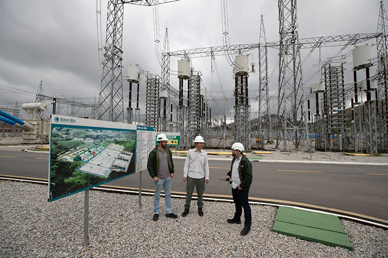 2022年9月30日,在巴西里约热内卢美丽山特高压输电二期项目里约换流站,国网巴控公司换流站运维主管(中)和巴方人员交谈。新华社记者 王天聪 摄