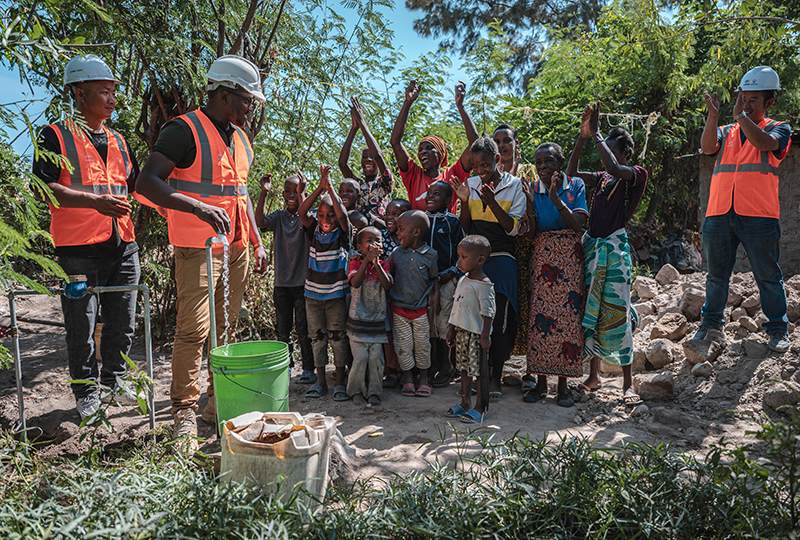 6月13日,在坦桑尼亚姆万扎省米松圭,凯尔文(左二)与同事接通水管后赢得当地居民鼓掌欢呼。新华社记者 王冠森 摄