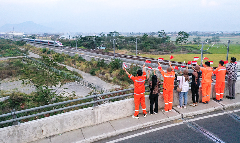 10月17日,在印度尼西亚万隆一座天桥上,雅万高铁建设单位之一中铁电气化局的中国和印尼籍员工挥舞着中国和印尼两国国旗,向远处驶来的一列雅万高铁高速动车组列车欢呼(无人机照片)。新华社记者 徐钦 摄
