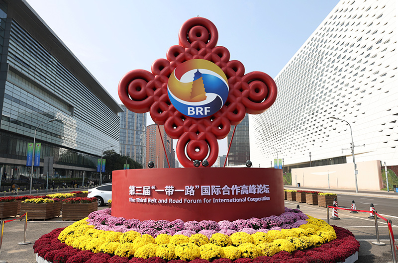 这是在北京国家会议中心附近拍摄的“一带一路”国际合作高峰论坛景观布置(10月17日摄)。新华社记者 陈斌 摄