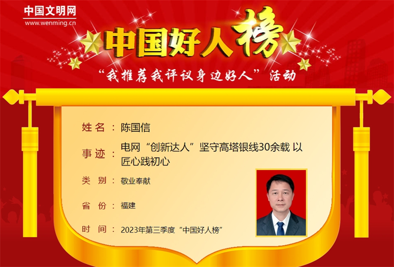 “把问题变成课题,把想法变成办法。我的追求,就是在各式各样平台上发挥好引领作用,推动劳模身边再出劳模,工匠身边再出工匠,让劳模精神工匠精神传承接力不息。” 陈国信创新工作室成立于2012年,他创建了一个点子培育出7个成果的“7N法则”和创新智慧库,不断解决电网带电作业技术难题,实现了以技术创新促进人才培养。陈国信最常说的一句话是,“这样还不行,还要继续改进!”一路走来,这个创新平台先后被全国总工会授予“全国示范性劳模和工匠人才创新工作室”,被国家人社部授予"陈国信技能大师工作室”。“把我的技术分享给大家,这样就会有更多的工匠一起守护城市电力,大家都一起来热爱这个岗位。”陈国信坚定地说,“我想带着一群人奔跑!”