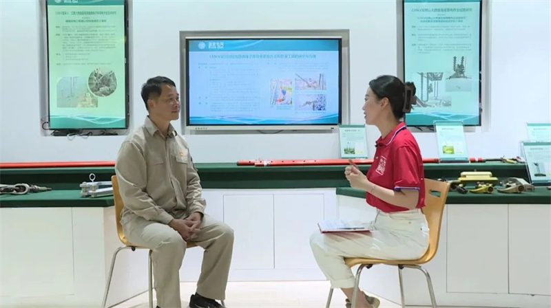 陈国信向记者介绍“利用无人机代替人工安装带电作业用挂线滑车”。中国文明网 王楠 摄