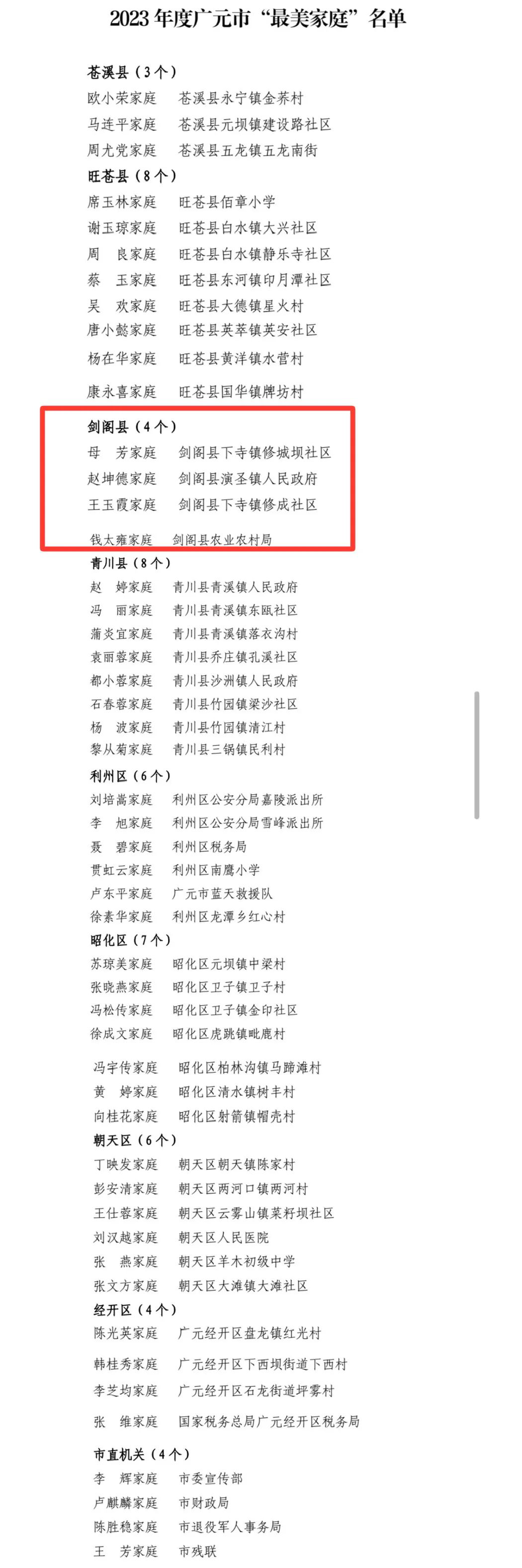 据悉,近年来,广元市持续开展“最美家庭”选树活动。自2018年以来,广元市共评选出322户市级“最美家庭”。其中,获得全国“最美家庭”的有7户,获得四川省“最美家庭”的有43户。