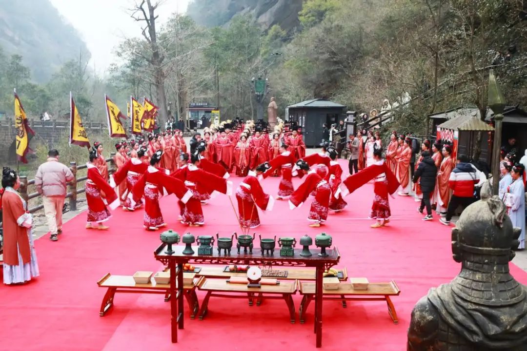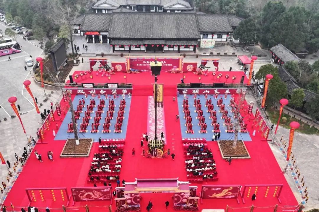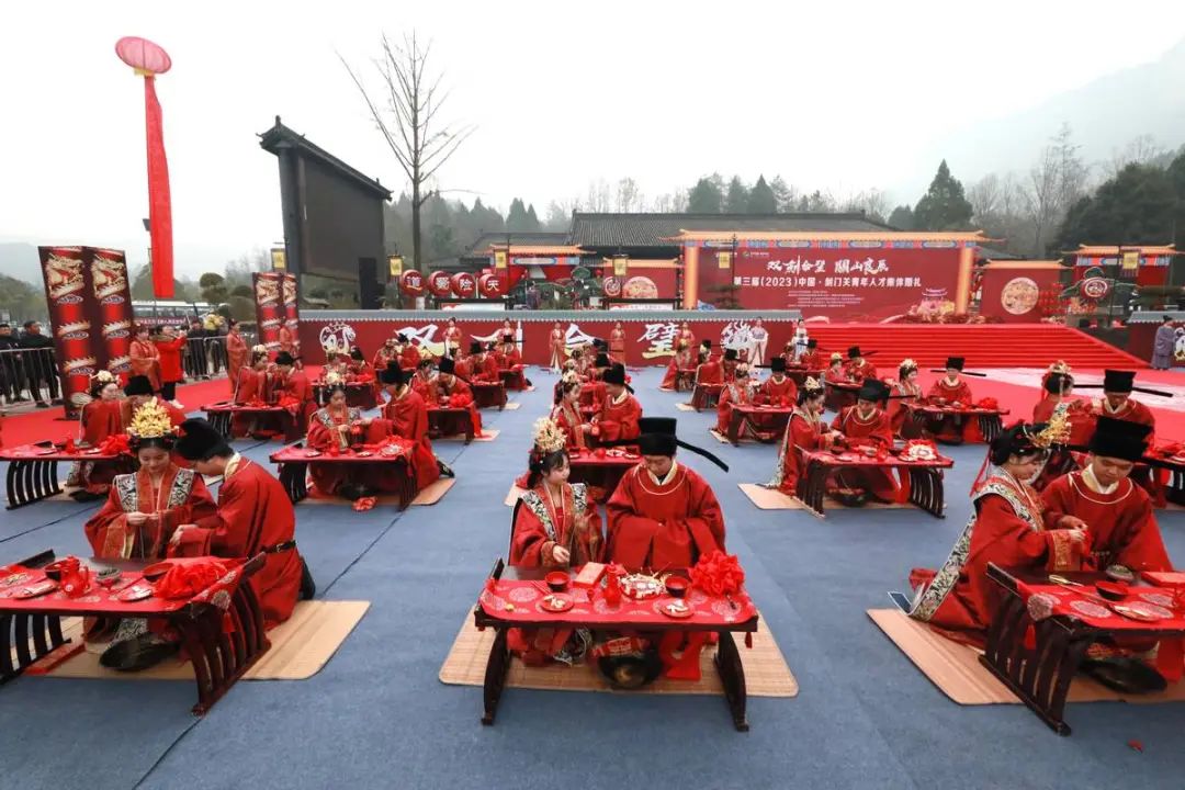苍松翠柏下,亮眼的中国红点亮了矗立千年的蜀道,鼓乐齐鸣,鸾歌凤舞,盛大喜庆的婚礼仪式不仅承载着对新人们的美好祝福,体现出人们对新年的无限期许,更是剑阁县对青年人才的贴心关爱。