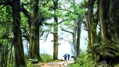 “剑门路,崎岖凹凸石头路。两行古柏植何人?三百长程十万树。翠云廊,苍烟护。苔花阴雨湿衣裳,回柯垂叶凉风度。”石栈钩连的古蜀道,凝结着古人的非凡勇气和智慧。植柏护路,成为代代赓续的优良传统。位于四川省广元市和绵阳市之间的剑阁蜀道上,有迄今规模最大、保存最完好的古代人工栽植驿道古柏群。清代诗人乔钵专门作诗,让这片延绵数百里的绿色长廊有了“翠云廊”的雅称。