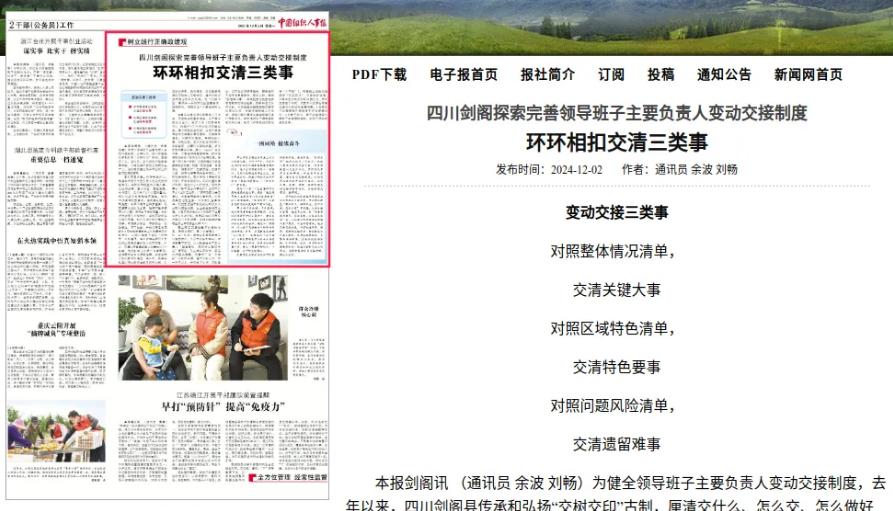 近日,剑阁探索完善领导班子主要负责人变动交接制度经验做法,被《中国组织人事报》刊发,全文如下
