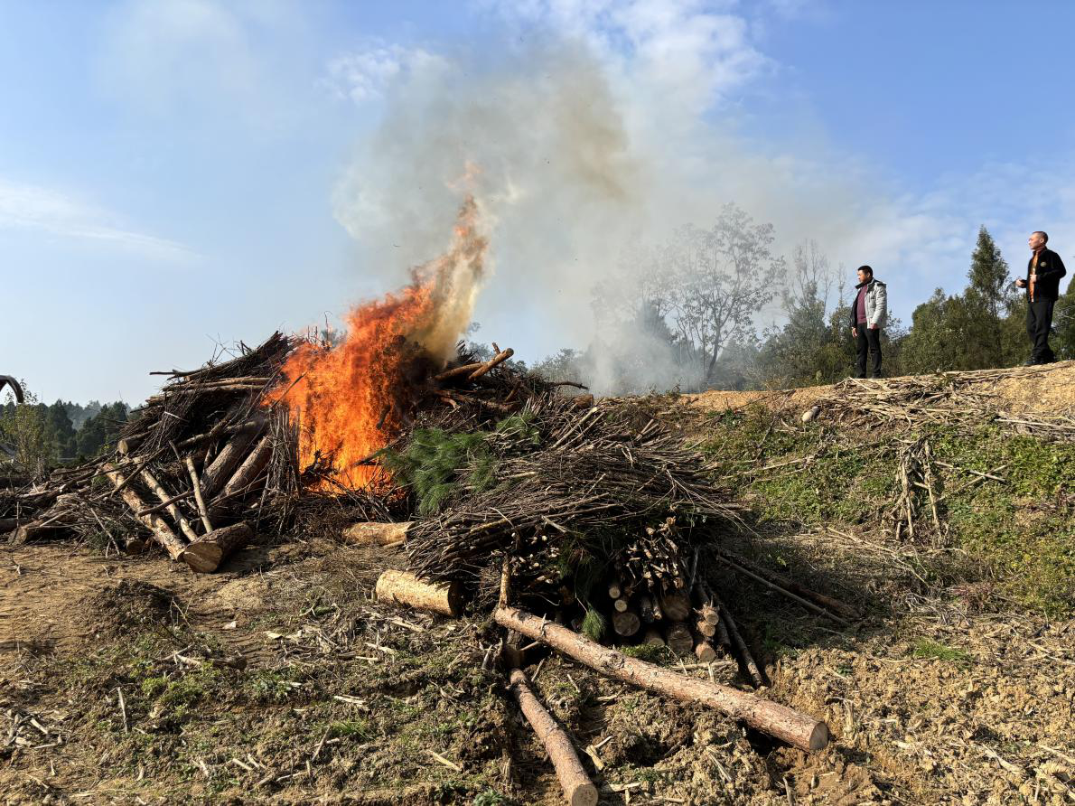 精准排查除隐患,集中焚毁保生态。对全镇范围内感染线虫病的松树进行精准排查与标记。在此次集中焚毁行动中,工作人员严格按照相关防治规范,有序地将疫木集中至指定地点,并采用专业设备进行焚烧处理,确保病源彻底消除,防止疫情扩散。
