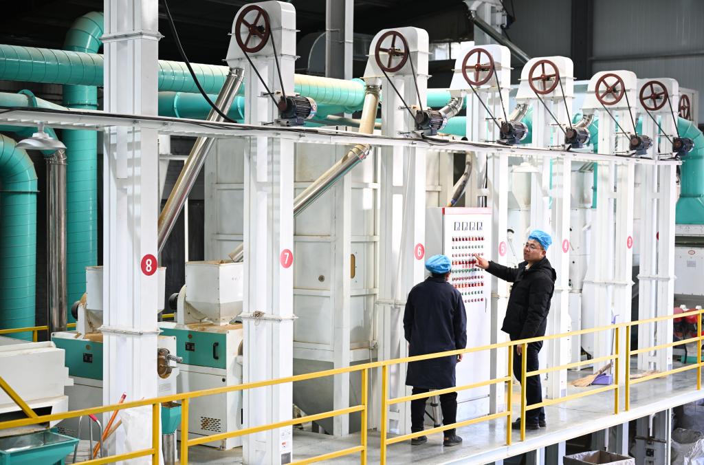 2025年1月10日,“95后”返乡创业大学生任宏宇(右)在陕西省榆林市米脂县米森农业发展有限公司的生产车间与工人交流设备运行情况。新华社记者张博文摄