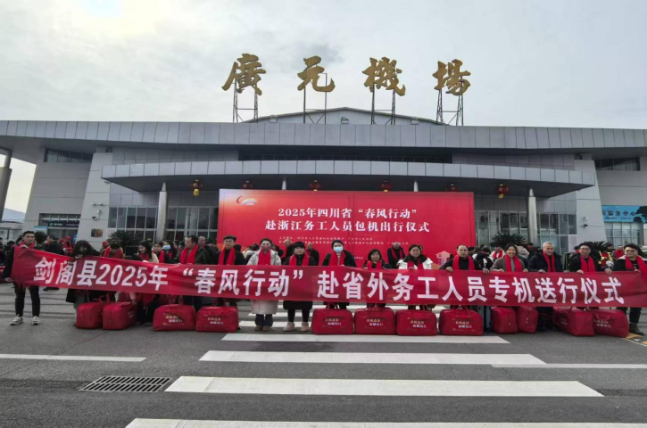 2月7日上午,剑阁县2025年“春风行动”赴省外务工人员专机启动仪式在广元盘龙机场举行。17名来自剑阁县各地的劳动者满载着家乡的祝福与期望,缓缓登上了“广元--杭州”国航CA1774客机。
