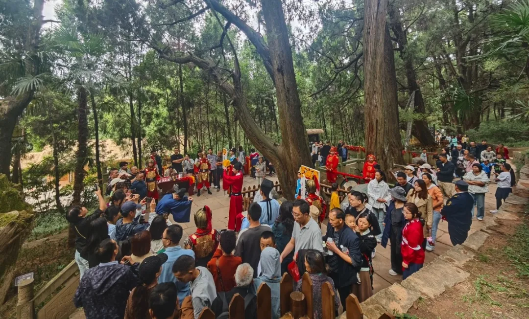 在翠云廊景区,《点树交印》古制巡演生动再现了古代剑州知州离任交接的庄重场景,演员们身着传统官服,按照历史记载的仪式流程,逐一清点、交接古柏名木,让游客直观了解古人"官树交接"的生态保护智慧,这一特色演出每日吸引数千游客驻足观看。剑门关关楼的“开关仪式”也吸引了无数游客的目光,仪式以庄严威武的表演再现古代军事关隘的雄风,身着古代铠甲的“守关将士”演绎开关、巡关、点兵等场景,并融入祈福环节,为游客送上“国泰民安、旅途平安”的美好祝愿。这些富有创意的文化演艺,不仅丰富了游客的出行体验,更让传统文化在互动中焕发新生,有效提升了剑阁文旅的品牌影响力。