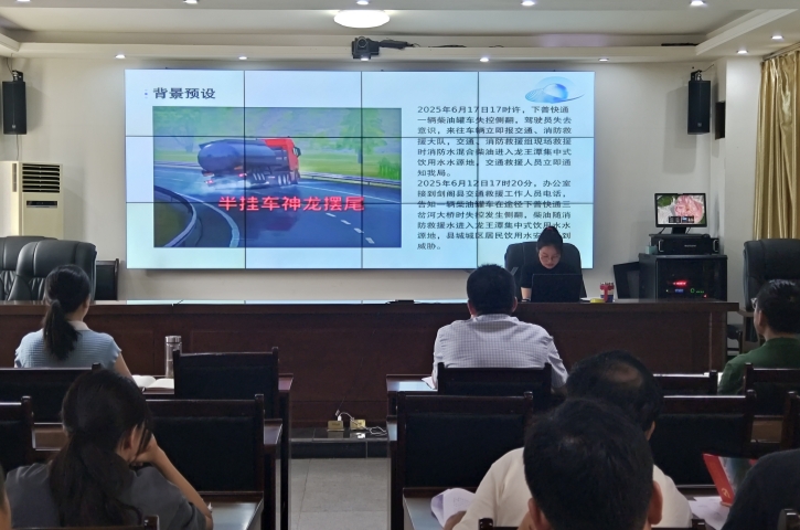 本次演练假设一辆柴油罐车在途径下普快通三岔河大桥时发生侧翻,导致油罐柴油泄漏,部分柴油进入龙王潭饮用水水源地,发生重大突发环境事件这一背景下进行桌面推演。模拟启动突发环境事件二级应急响应,根据《剑阁县突发环境事件应急预案》,成立现场应急指挥部,组建综合协调、应急处置、医疗救援、应急监测、社会维稳、宣传舆情6个工作组开展应急处置工作。同时,根据应急响应等级和程序,向广元市生态环境局报告,市生态环境局接报后,立即报省生态环境厅,省生态环境厅经研判决定启动二级应急响应,并派出专家组,指导市、县工作组开展应急处置工作,通过在污染团周边布设2道围油栏,拦截油污,并投放吸油毡吸附油污;在第一道围油栏内、第二道围油栏外、取水口布点,开展每2h一次的连续监测,掌握龙王潭饮用水水源地水质状况。整个推演过程衔接顺畅、考虑全面、内容丰富,初步达到以演备战的预期效果。