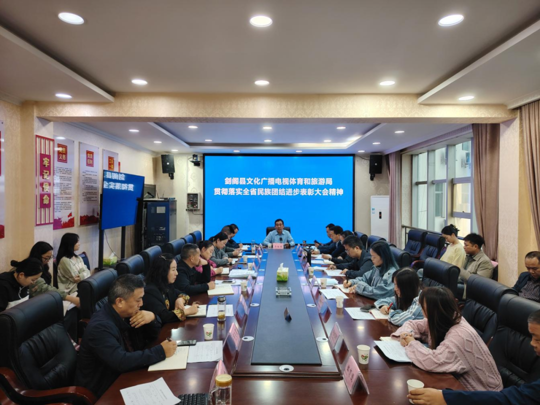 10月11日,剑阁县文化广播电视体育和旅游局召开专题会议,专题学习贯彻全省民族团结进步表彰大会精神,学习贯彻省委书记王晓晖重要讲话精神,研究贯彻落实意见。会议传达学习大会精神和省委书记王晓晖的重要讲话精神。党组书记、局长郭绍思分享了在成都参加全省民族团结进步表彰大会的所见所闻。郭绍思强调,我局被省委、省人民政府授予“四川省民族团结进步模范集体”荣誉称号,是对我们开展民族团结进步工作的高度认可,这份沉甸甸的荣誉让人无比激动和振奋,来之不易,是激励更是鞭策。