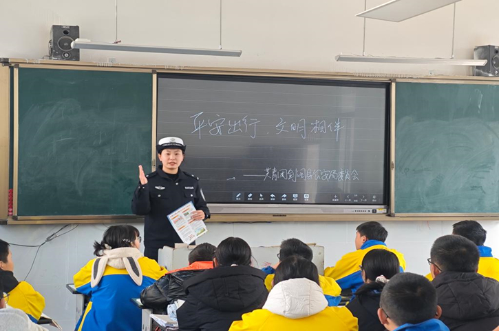 随后,青年民辅警带着从红色历史中汲取的力量,走进剑门中学,将研学感悟转化为服务社会的实际行动。他们围绕防范电信网络诈骗、抵制校园欺凌、遵守交通法规等内容,通过案例讲解、互动问答、发放宣传册等多种形式,为在校师生献上了一堂生动的法治安全课。课堂气氛热烈,取得了良好的宣传效果。